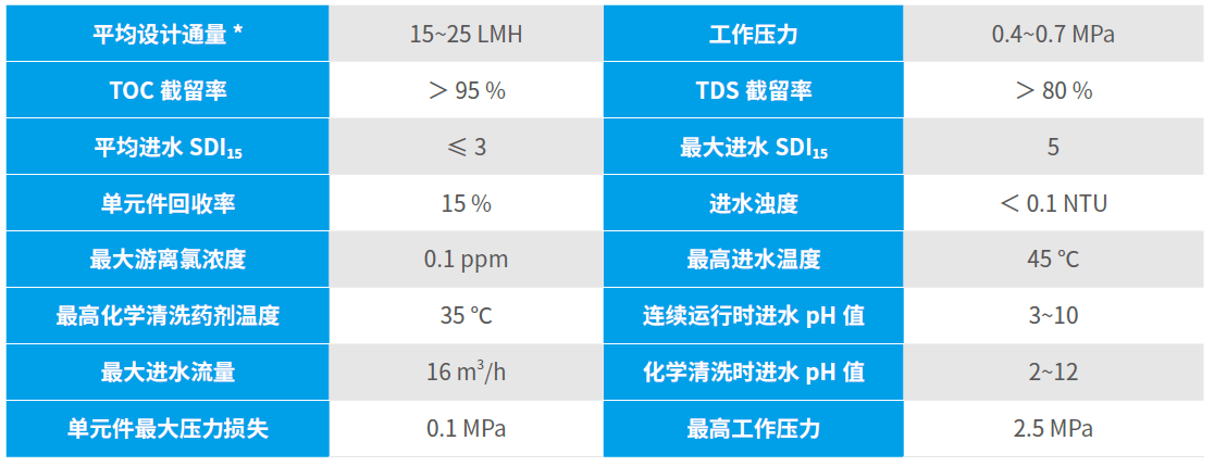 工作压力低 系统工作压力0.4~0.7 MPa,较传统低压反渗透膜低30 % 以上;