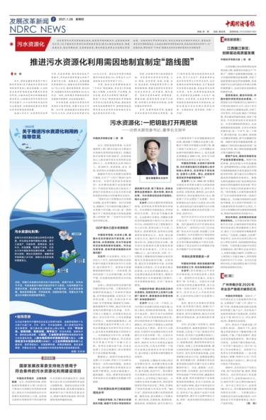 近日,国家发展改革委、生态环境部等十部门联合印发《关于推进污水资源化利用的指导意见》,明确总体目标要求为到2025年,全国地级及以上缺水城市再生水利用率达到25%以上,京津冀地区达到35%以上。到2035年,形成系统、安全、环保、经济的污水资源化利用格局。 酝酿多年的污水资源化政策终于落地,打开了“十四五”期间行业市场空间。目前行业的技术发展如何?还有哪些阻碍行业发展的掣肘?中国经济导报记者日前走访了我国污水处理龙头企业北京碧水源科技股份有限公司的董事长文剑平。 “国家在这个时期提出污水资源化战略,是非常关键的。将污水资源化,既解决了水污染的问题又解决了水资源少的问题,可以说,是一把钥匙打开了我国高质量可持续发展瓶颈上的两把‘锁’。”文剑平告诉中国经济导报记者。
